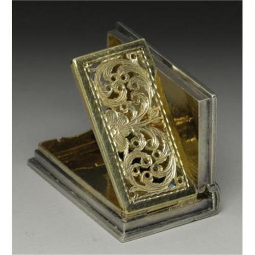 <B>A George III Silver Vinaigrette</B></I><BR><BR>Taylor & Perry, Birmingham, England<BR>1810-11<BR>Silver and silver gilt<BR>Marks: (lion passant), (anchor), (monarch profile), <I>T&P, m</B></I><BR>1.31 in. long, .45 troy ounces<BR><BR>In the form of a book with machine turned decoration; pierced shell and scroll grill. Silver gilt interior.<BR><BR><b>Shipping:</b> Requires 3rd Party Shipping (<a target="_blank" href="http://www.heritageauctions.com/common/shipping.php">view shipping information</a>)