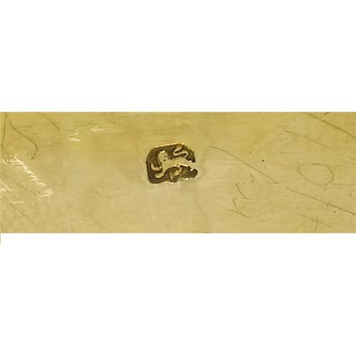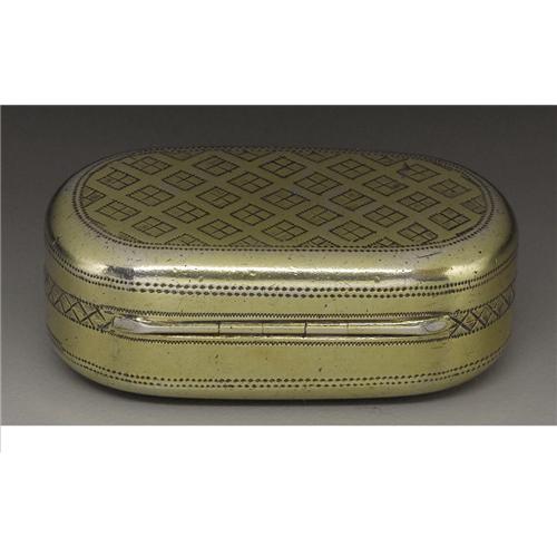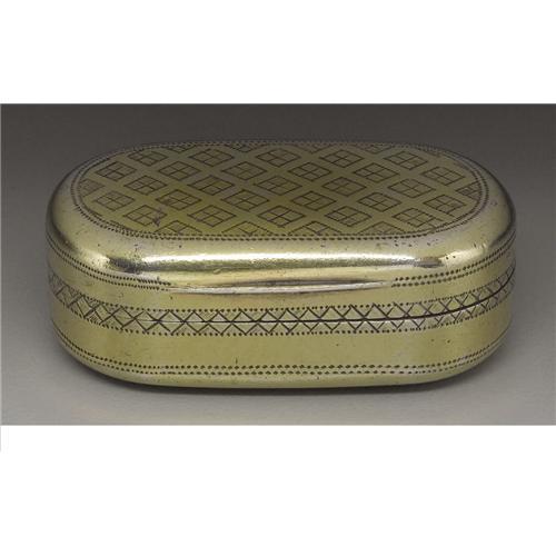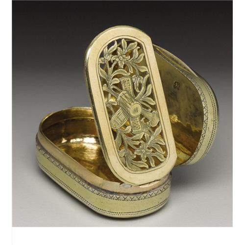 <B>A George III Silver Gilt Vinaigrette</B></I><BR><BR>Possibly John Beldon, London, England<BR>1803-04<BR>Silver gilt<BR>Marks: (lion passant), (leopard's head), (monarch profile), <I>...B, H</B></I><BR>1.75 in. long, 1.09 troy ounces<BR><BR>Of lozenge shape with engraved diaper pattern decoration to top and bottom; pierced grill with musical instrument trophy design.