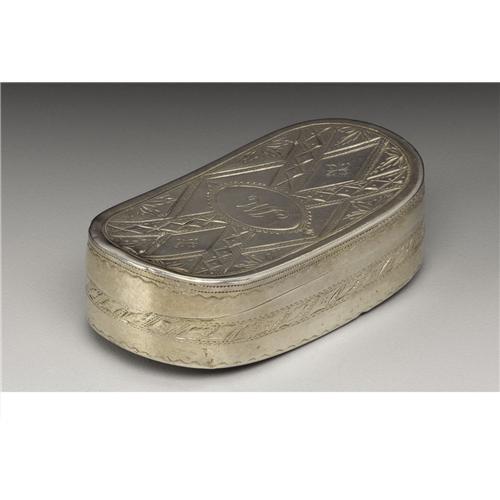 <B>A George III Silver Snuff Box</B></I><BR><BR>Samuel Pemberton, Birmingham, England<BR>1801-02<BR>Silver and silver gilt<BR>Marks: (lion passant), (anchor), (monarch profile), <I>SP, d</B></I><BR>2.5 in. long, 1.28 troy ounces<BR><BR>With bright cut decoration. Monogrammed <I>IM.</B></I> Silver gilt interior.<BR> <BR><BR><B>Important notice:<