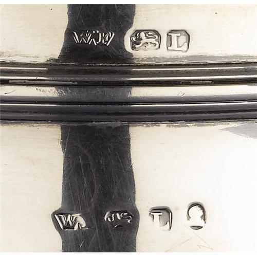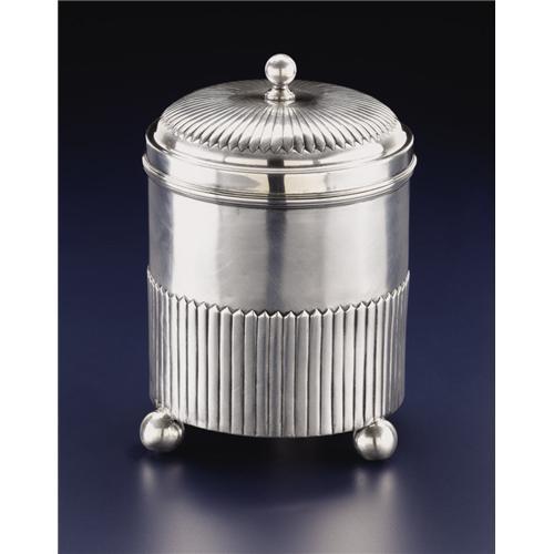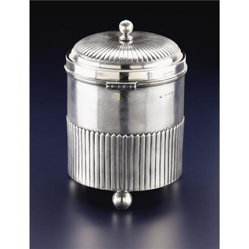 <B>A George III Silver Tea Caddy</B></I><BR><BR>William Fontain<BR>London, England<BR>circa 1806-1807<BR>Silver<BR>Marks: (lion passant), (duty mark), <I>WF, L</B></I><BR>7.86 inches high x 5.5 inches diameter<BR>22.97 troy ounces<BR><BR>Of cylindrical form with part fluted decoration; hinged lid with radiating fluted decoration and ball finial; raised on three ball feet. <B>Condition Report:</B> Normal signs of wear as appropriate with age; creasing to bottom.<BR><BR><b>Shipping:</b> Requires 3rd Party Shipping (<a target="_blank" href="http://www.heritageauctions.com/common/shipping.php">view shipping information</a>) <BR><BR><B>Important notice:<