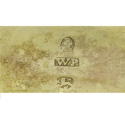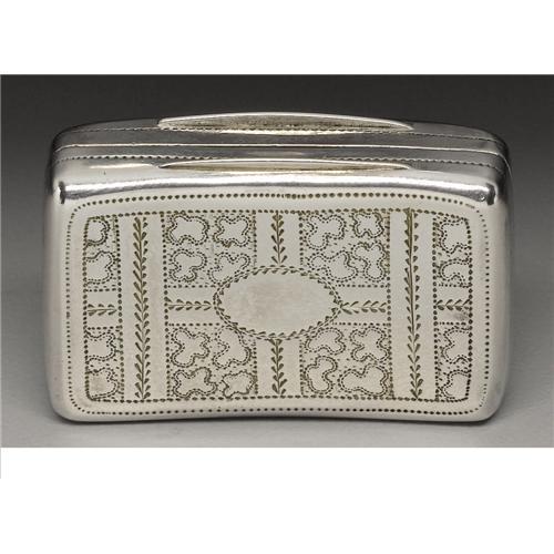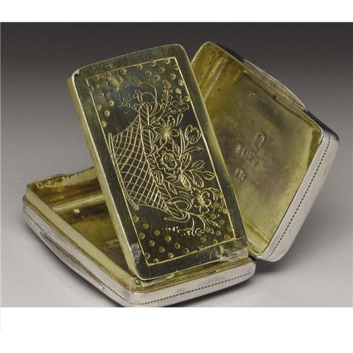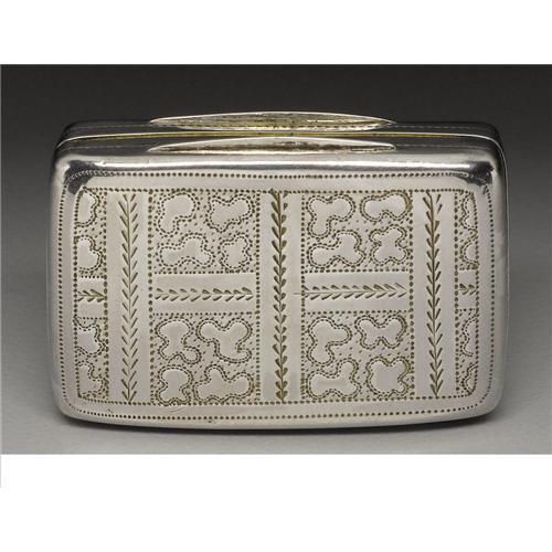 <B>A George III Silver Vinaigrette</B></I><BR><BR>William Pugh, Birmingham, England<BR>1810-11<BR>Silver and silver gilt<BR>Marks: (lion passant), (anchor), (monarch profile), <I>WP, m</B></I><BR>1.31 in. long, .45 troy ounces<BR><BR>Of curving form with bright cut decoration of meandering scrolls within parterre design; punch pierced grill with incised floral bouquet in basket. Silver gilt interior.