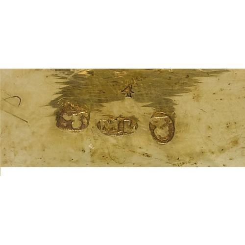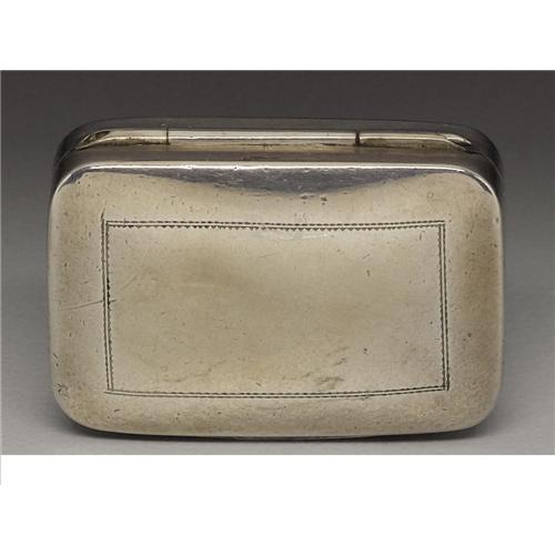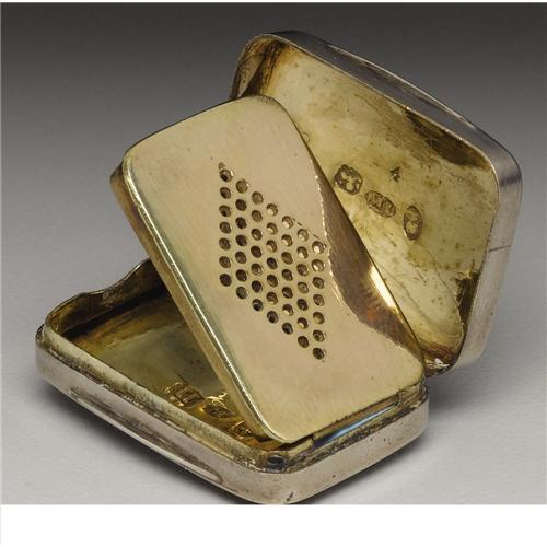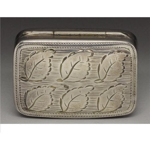 <B>A George III Silver Vinaigrette</B></I><BR><BR>Matthew Linwood, Birmingham, England<BR>1811-12<BR>Silver and silver gilt<BR>Marks: (lion passant), (anchor), (monarch profile), <I>ML, n</B></I><BR>1.12 in. long, .82 troy ounces<BR><BR>Incised with six leaves on reeded ground; diamond pattern punched grill. Silver gilt interior.