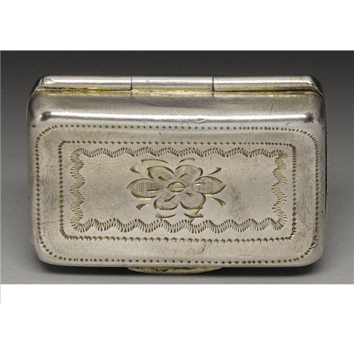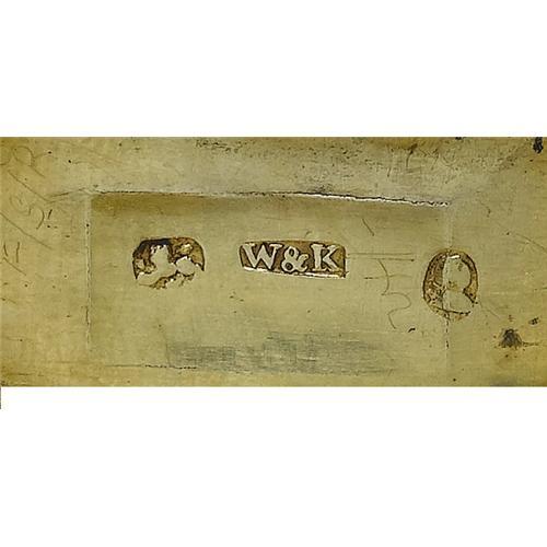 <B>A George III Silver Vinaigrette</B></I><BR><BR>Wardell & Kempson, Birmingham, England<BR>1814-15<BR>Silver and silver gilt<BR>Marks: (lion passant), (anchor), (monarch profile), <I>W&K, q</B></I><BR>1.25 in. long, .36 troy ounces<BR><BR>Of curved form with bright cut border with rectangular reserve to top, engraved floral spray within border to bottom; elaborate pierced scroll grill. Silver gilt interior.1 <BR><BR><B>Condition Report:</B> Normal signs of wear as appropriate with age. Minor denting to top.