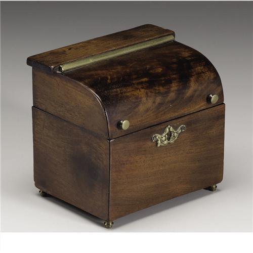 <B>A George III Walnut Tea Caddy</B></I><BR><BR>Unknown maker, England<BR>Late Eighteenth Century<BR>Walnut and brass<BR>Unmarked<BR>4.75 in. high x 5.25 in. wide x 3.87 in. deep<BR>Of miniature roll-top desk form, raised on brass feet, with brass escutcheon, pulls and roll at top.<BR> <BR><BR><B>Important notice:<
