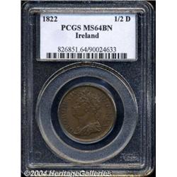 A George III and George IV pair as follows: 10 Pence Bank token 1813, KM-Tn5, AU58 PCGS; and a Halfpenny 1822, KM150, MS64 Brown PCGS.From the Craig Haller Collection. 2 coins Important notice: Heritage usually auctions material at the rate of 200-250 lots per hour. On some occasions eBay Live bid software or the Internet may not be able to keep up with the pace of the auction. We recommend placing a realistic absentee bid now as insurance to avoid disappointment. Occasionally the auctioneer may eliminate or reject an eBay Live bid, and the auctioneer may also reopen a lot after the close of the eBay live bidding (usually because we missed an audience bid), and may reject your bid even if it shows you as the winning bidder. By bidding via eBay Live, you agree that Heritage may award the lot to another bidder at its sole discretion under the circumstances described above or any other reasonable circumstances. Also please note that all Heritage lots purchased through eBay Live carry a 20% Buyer's Premium. Please make sure you read the Terms and Conditions before you bid.
