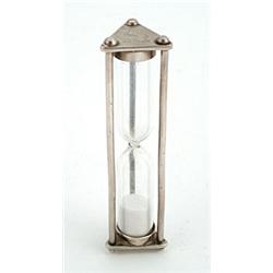A George III egg timer in a triangular frame engraved with a crest, London 1800 by Thomas Phipps and Edward Robinson II, 9cm long (3.5 in)
