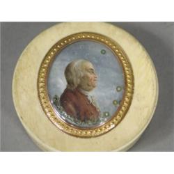 A George III ivory veneered snuff box with a tortoiseshell interior, the lid with a profile of a gent on mother of pearl within a gold metal mount, 7cm diameter Est. 150/200