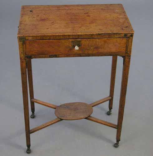 A George III mahogany caddy topped side table, with banded sides fitted with a single drawer on square tapered legs with uniting stretchers, 1ft 6.5ins £700-1,000