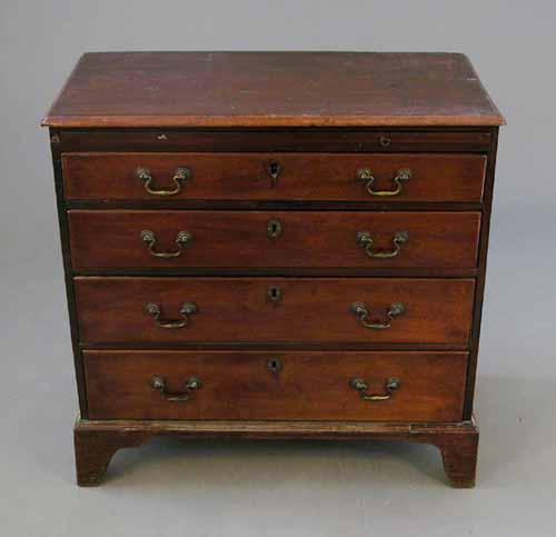 A George III mahogany chest, of four long graduated drawers beneath a brushing slide, on bracket...