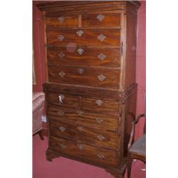A George III mahogany chest on chest, the associated upper section with moulded dentil cornice abov.