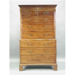 A George III mahogany chest on chest, the upper section with a dentil cornice, and inlaid frie...