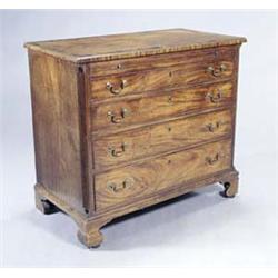 A George III mahogany chest, the walnut crossbanded and chequer strung top above a crossbanded and baize inset slide and four long graduated drawers with brass handles, flanked by reeded quarter pilasters on bracket feet, 84 high x 94.5cm wide (the walnut crossbanding and chequer stringing of a later date) £700-900