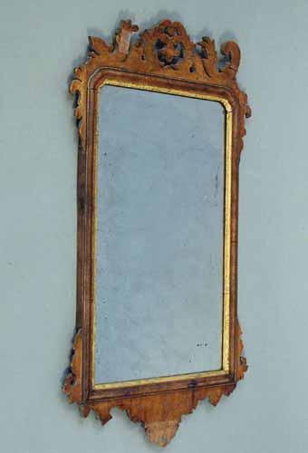 A George III mahogany fret cut wall mirror, the plate 1ft 8ins x 1ft, (with faults) £80-120