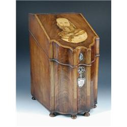 A George III mahogany knife box, later inlaid with a portrait of Garibaldi on the lid and fitted for stationery in the interior, the shaped serpentine front with white metal key escutcheon between inlaid fluted pilasters, all on six bun feet, 40.5cm high £200-300