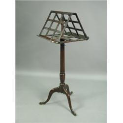 A George III mahogany music stand, the double sided adjustable top with lattice panels and hinged music rests, on a fluted and turned vase shaped column, and a tripod base