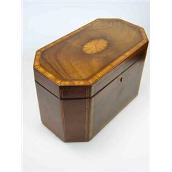 A George III mahogany tea caddy, the canted rectangular lid satinwood cross banded about central ova