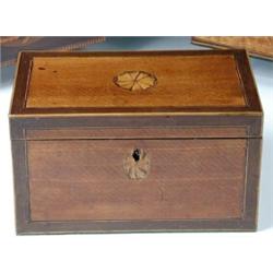 A George III mahogany tea caddy, the rectangular top and front inlaid with paterae within specimen..