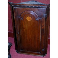 A George III oak hanging corner cupboard, the moulded dentil cornice above a shell inlaid arch pane.