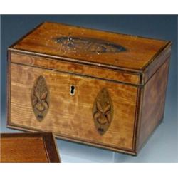 A George III satinwood tea caddy, the rectangular lid inlaid with central butterfly within box and ebony line and rosewood cross banding, the front with two vases of flowers in harewood ovals, 20cm wide £150-200