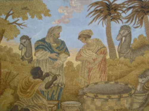 A George III silk embroidery, depicting a biblical scene, 35cms x 49cms...