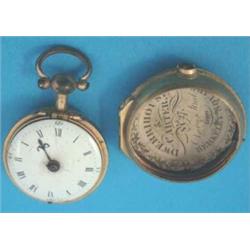 A George III small gilt copper pair case pocket watch with enamelled Roman dial and verge movemen...