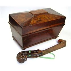 A George III specimen wood sarcophagus tea caddy, the corners of the top inlaid with triangles of rosewood on burr walnut below a satinwood rectangle, the sides of mahogany, the interior with two compartments, 23.5cm wide together with a lion headed violin neck, 25cm long (2) £80-120