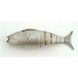 A George III vinaigrette in the form of an articulated fish naturalistically engraved with fins and gills, the head opens to reveal the foliate pierced and engraved grille, Birmingham 1817 by Lea & Co, 8.5cm long (3.33 in)