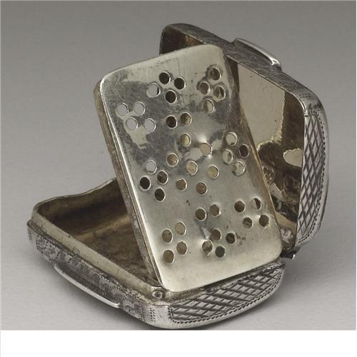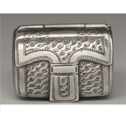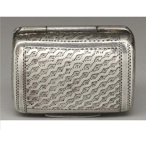 <B>A George IV Silver Vinaigrette</B></I><BR><BR>Ledsam & Vale, Birmingham, England<BR>1822-23<BR>Silver and silver gilt<BR>Marks: (lion passant), (anchor), (monarch profile), <I>L&Co., y</B></I><BR>.87 in. long, .18 troy ounces<BR><BR>Of rectangular form, the top decorated in the form of a valise with bright cut decoration; silver gilt interior with plain punch pierced grill. <BR><BR><B>Important notice:</