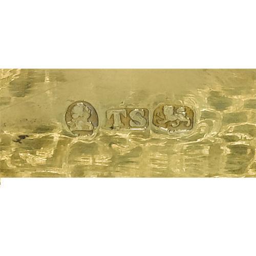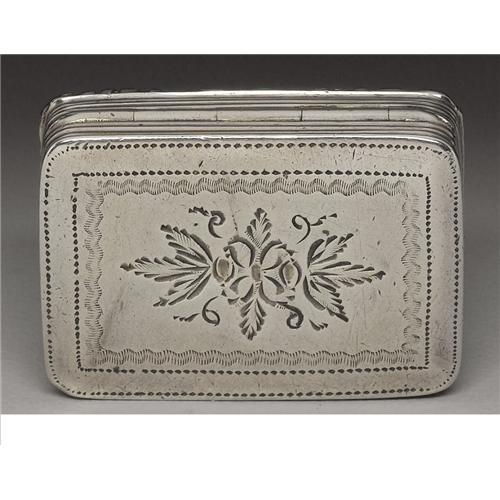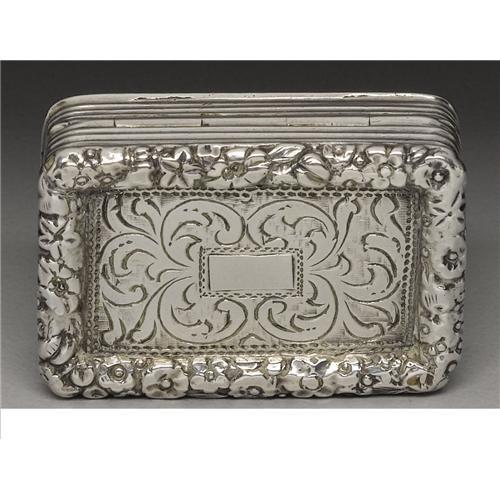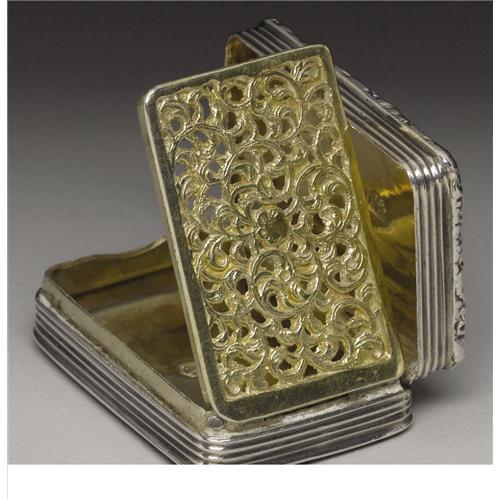 <B>A George IV Silver Vinaigrette</B></I><BR><BR>Thomas Shaw, Birmingham, England<BR>1826-27<BR>Silver and silver gilt<BR>Marks: (lion passant), (anchor), (monarch profile), <I>TS, C</B></I><BR>1.25 in. long, .54 troy ounces<BR><BR>With incised scroll decoration framing a rectangular reserve, cast floral border and reeded sides, the bottom with incised floral scroll within borders; pierced floral and vine grill. Silver gilt interior. <BR><BR><B>Important notice:</