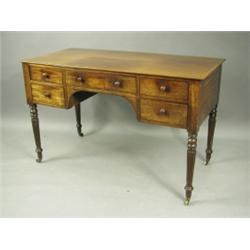 A George IV mahogany writing table, with five drawers, on turned and reeded legs, 122cm wide x...