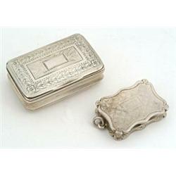 A George IV rectangular snuff box with concave sides and engraved with a border of flowers, Birmingham 1830 by Nathaniel Mills, 5.5cm (2.25 in), and an engine turned rectangular vinaigrette of shaped outline with concave sides and a foliate scroll grille, 1845 by Edward Smith, 4cm (1.5 in)