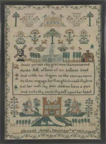 A George IV sampler, finely worked in a variety of silk stitches with a verse, house and memorial country garden, church, windmill, cottage, dove cot and motifs within a strawberry border by Elizabeth James, December 8th 1824, aged 8, framed 1ft 5ins x 1ft 1in £400-500
