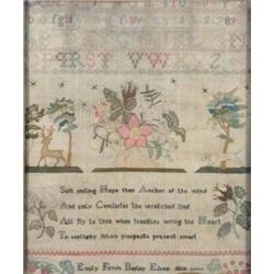 A George IV sampler, worked with alphabet, numerals, verse, deer, hunting dog and basket of flowers by Emily Firmin Borely, Essex 1824, framed 12ins x 10ins £150-200