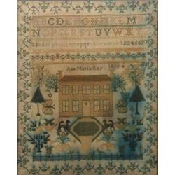 A George IV sampler, worked with the alphabet, numerals, Georgian house and garden, within a strawberry border by Ann Maria Ray, 1833, framed (a.f) 1ft 4ins x 1ft 1ins £100-150