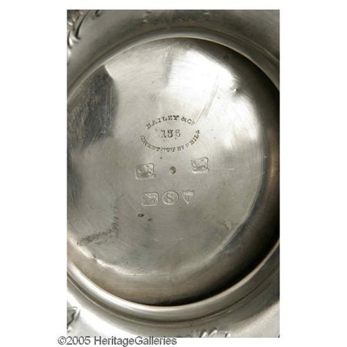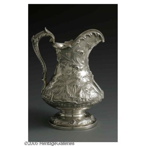 <B>An American Silver Pitcher</B></I><BR>Mark of George B. Sharp, Philadelphia, PA, Mid-Nineteenth Century<BR><BR>The scenic repousse pitcher with a commemoration to the front <I>To Annie July 25, 1856,</B></I> hallmark underside with <I>BAILEY & CO. CHESTNUT ST PHILA /136,</B></I> total weight 36 Troy ounces<BR>11in. high1 Items <BR><BR><B>Condition Report:</B> Normal signs of wear as appropriate with age; two small dents to the underside of the pitcher body, one approx. 5/8in. long, the other 3/8thin. diameter.
