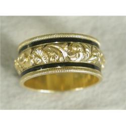 A George V 18ct gold mourning ring with a central engraved and embossed foliate band within black enamel borders, inscription to inside shank 'John Lens Esq, died 6 Aug 1825 aged 68', size P Est. 250/300