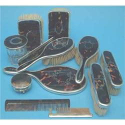 A George V 5-piece silver and tortoiseshell dressing table set , a pair of similar brushes, two t...