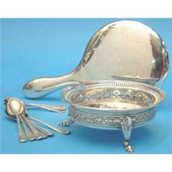 A George V pierced silver bowl (10oz.) a mirror and 10 spoons....