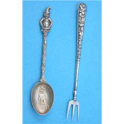 A George V silver 'Mr Punch and Toby' teaspoon, and a pickle fork. £40-50