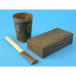 A George VI silver cigarette box, Birmingham 1938, a Victorian silver handled paper knife, a Swedish paper knife (ivorine blades) and a Continental white metal mounted horn beaker £80-120