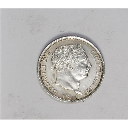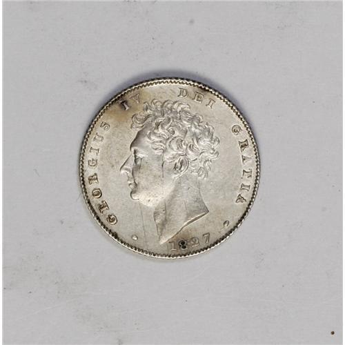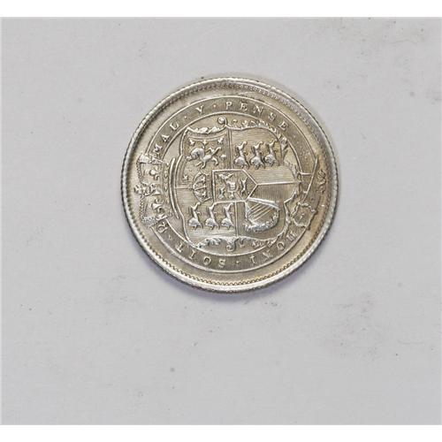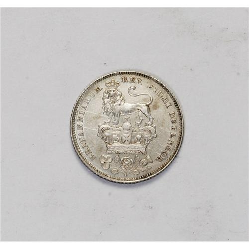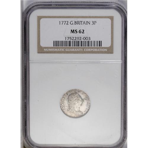 <B>A George trio as follows:</B></I> George III Threepence 1772, S-3753, MS62 NGC; George IV Sixpence 1827, S-3815, XF details with scratches on both sides; and a George III 1820 Shilling, S-3790, lightly cleaned AU, with remaining luster. <B>A sold as is, no return lot.</B></I>