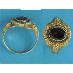 A Georgian design gold ring, set with an oval garnet within foliate chased bezel and shoulders, closed back £100-150