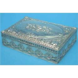A German 800 standard cigarette casket decorated with swags and dancing cherubs, 7.5ins....