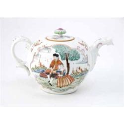 A German Dutch decorated globular teapot and a cover with bird's head spout and scroll handle, each side painted with figures in landscape panels, 5.25ins. wide, repair to handle, circa 1770. Provenance Christies 3rd October 1977 - Lot 95 £150-200