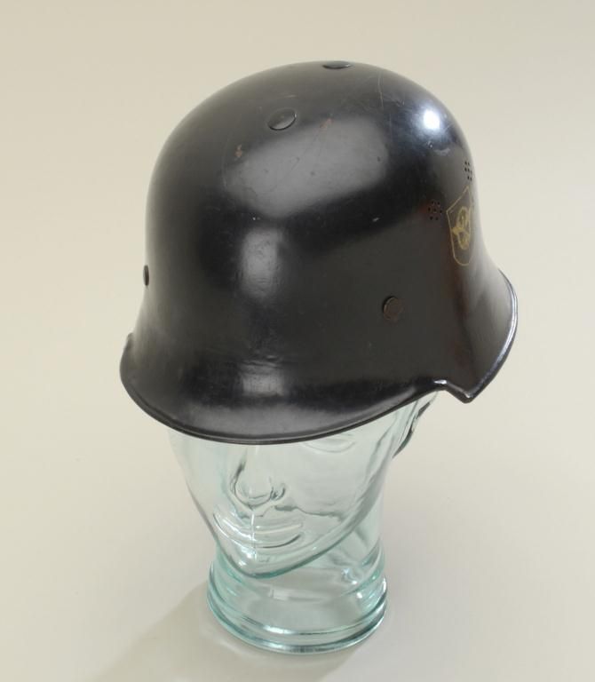 A German Police helmet showing 2 decals original liner and chin straps intact. Interior ID'd in pen. "German Helmet" found in Germany by James Morgan; June 1944 with soldiers address and phone number. Germansoldier's name written in top of liner, which is Schnieder. The body of the helmet shows some touch up paint or clear lacquer. Est.; $200.-$400.