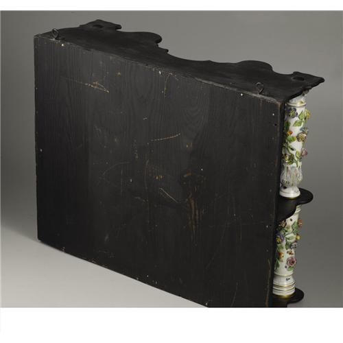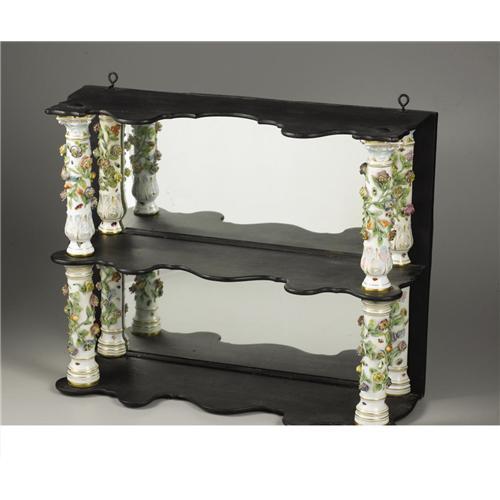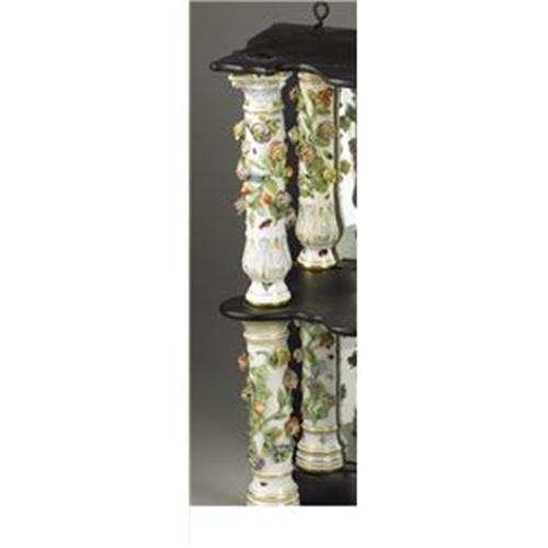 <B>A German Porcelain and Ebonized Wood Etagere</B></I><BR><BR>Unknown maker, Germany<BR>Circa 1880-1900<BR>Porcelain with polychrome enamel and gilt decoration, ebonized wood, mirrored glass<BR>Unmarked<BR>20.75 in high x 26 in. wide x 9 in. deep<BR><BR>Of two shelf form, the four full round porcelain columns and four engaged columns, decorated with relief floral and painted decoration, the front of the shelves scalloped.1 <BR><BR><B>Condition Report:</B> Normal signs of wear as appropriate with age. Minor crazing to porcelain.