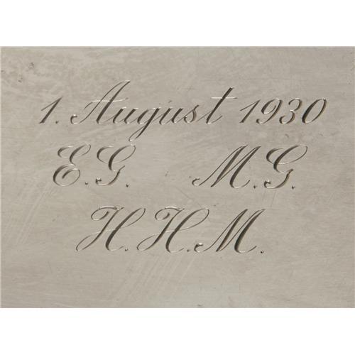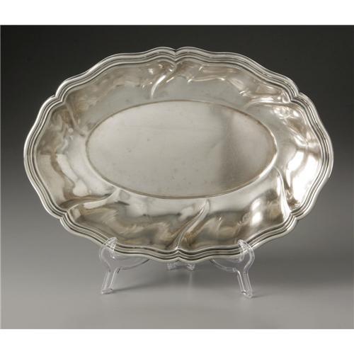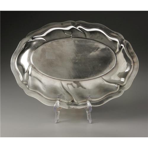 <B>A German Silver Tray</B></I><BR><B>H.J. Wilim, Berlin, Germany, Late Nineteenth Century</B></I><BR><BR>The oval bread tray with fluted sides, engraved underside <I>1. August 1930/E.G. M.G./H.H.M,</B></I> hallmark to the underside, total weight 12.8 Troy ounces<BR>1.9in. high x 12in. long <BR><BR><B>Important n