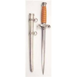 A German Third Reich dagger, the matted silvered sheaf applied with foliate cast suspension bands, the quillon applied with an eagle with spread wings, gadrooned yellow composition handle, 15.5 ins. £500-700