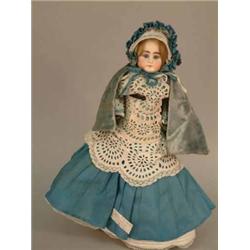 A German shoulder bisque doll, unmarked but attributed to Simon & Halbig, with fixed glass paperweight eyes and closed mouth, on kid-leather body, clothed in blue silk with cape and bonnet, 16.5ins £70-100