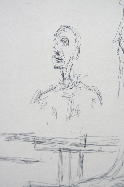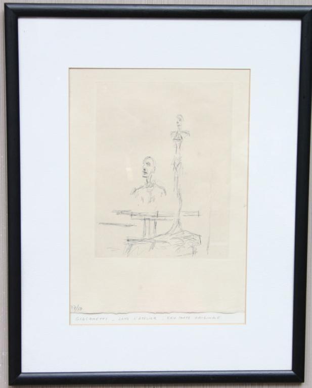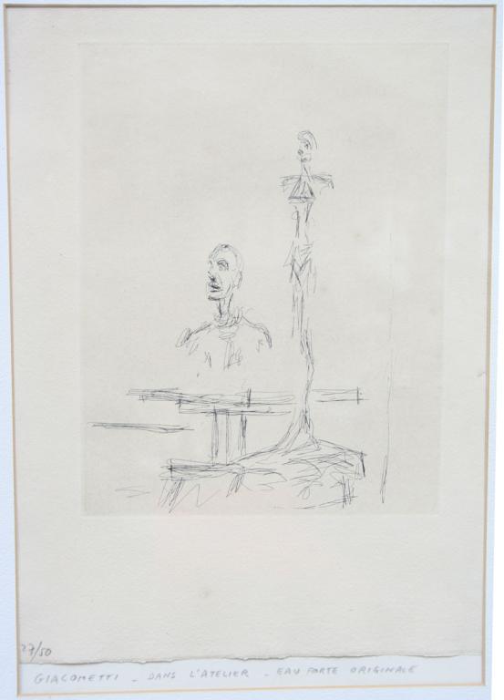 Alberto Giacometti (Swiss, 1901-1966), "Dans L'Atelier", numbered 27/50 in graphite lower left, inscribed in graphite bottom margin "Giacometti Dans L'Atelier-Eau Forte Originale", matted and framed. 21 1/2" x 17" (framed). Condition: very good, no damage or repair, not examined out of frame.